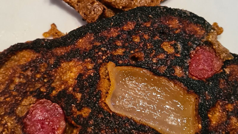 Jetzt kommen die Produkte von der Fleischtheke zum Einsatz, die eingangs schon angedeutet wurden. Traditionell wird luftgetrocknete Mettwurst, fetter oder durchwachsener Speck als Topping auf den Teig gelegt und dann wie ein Pfannkuchen ausgebacken. Natürlich sind aber modernen Interpretationen keine Grenzen gesetzt und so können auch andere salzige Köstlichkeiten für das gewisse Etwas sorgen. Nur eines ist besonders wichtig: Es sollen keine großen platten Pfannkuchen werden. Stattdessen werden eher kleinere, dickere Küchlein aus dem Teig geformt.